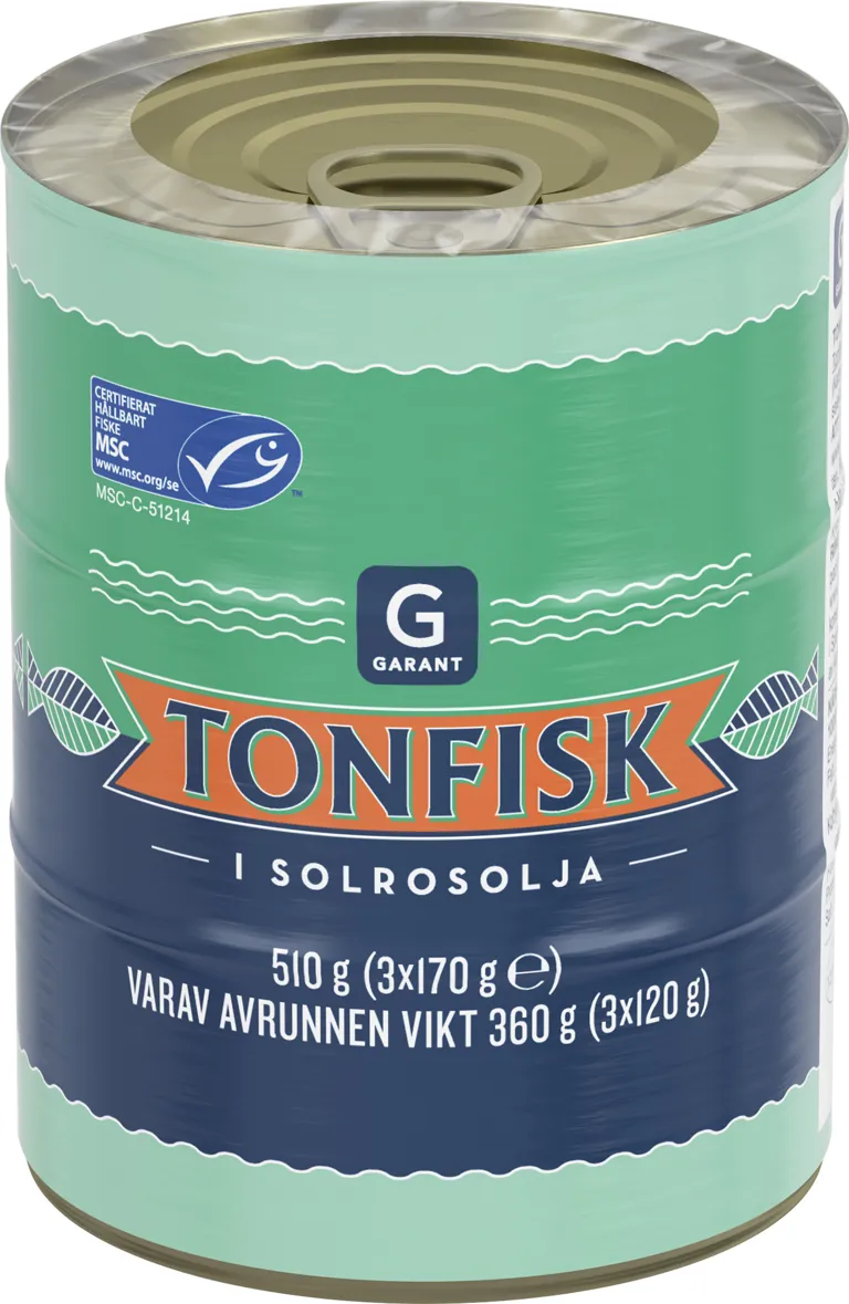 När du väljer tonfisk med MSC-certifiering kan du känna dig trygg i att fisken är ett bra val, fiskad med säkra metoder, hållbara bestånd och med full spårbarhet. Fisken är också fångad från fartyg med höga krav på minsta miljöbelastning. Ett bra val för både dig och miljön! Glöm inte att källsortera burken som metall och foliet som plast i materialåtervinningen.
