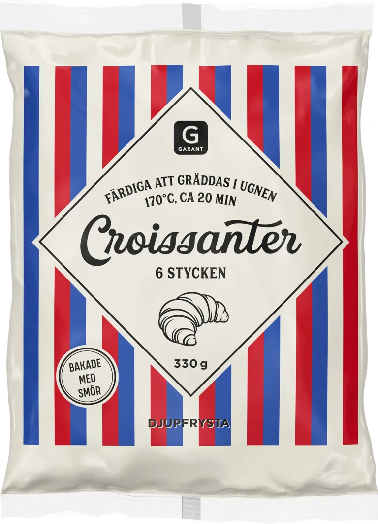 Djupfrysta croissanter bakade med smör. Färdiga att gräddas i ugnen. 6 stycken.