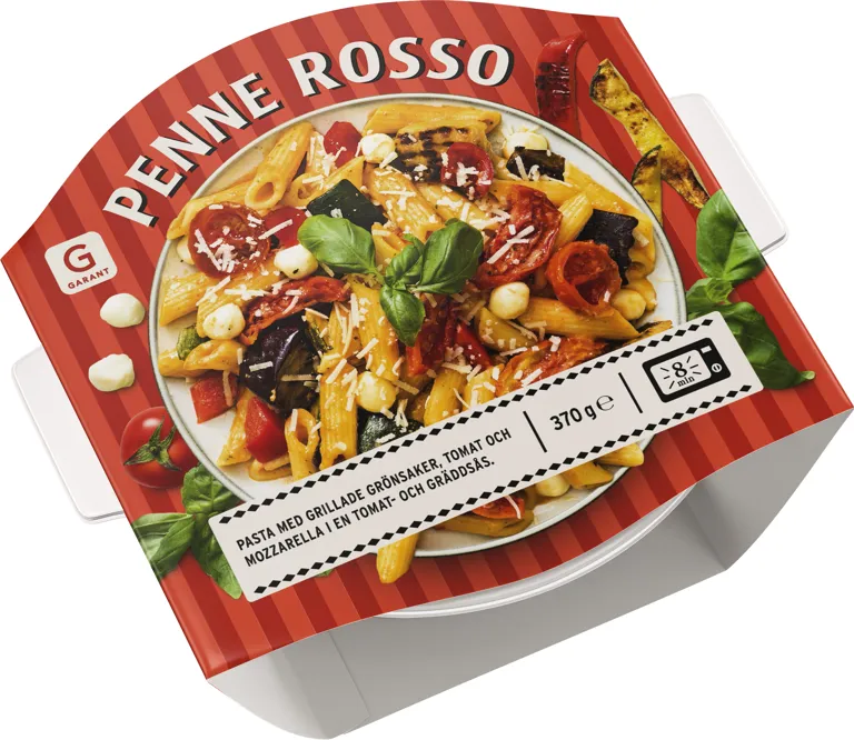 Djupfryst penne rosso med grillade grönsaker, tomat och mozzarella i en tomat-och gräddsås. 370 gram.