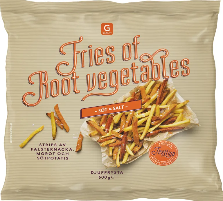 Djupfrysta rotfruktspommes med palsternacka, sötpotatis och morot. 500 gram.