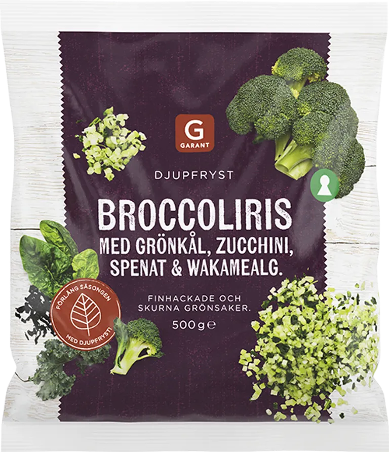 Broccoli 50%, grönkål 18%, spenat 15%, zucchini 15%, ekologisk wakamealg 2%. Alla grönsaker utom wakamealge är förvällda. Samtliga grönsaker är styckfrysta.