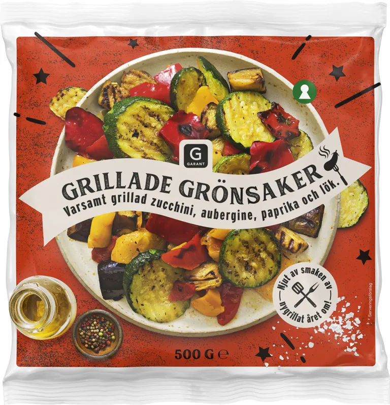 Grillad paprika 40% (röd paprika, gul paprika, grön paprika), grillad zucchini 25%, grillad aubergine 25% (aubergine, solrosolja), grillad lök 9,5%. Ursprung zucchini, aubergine, paprika och lök: Spanien.
