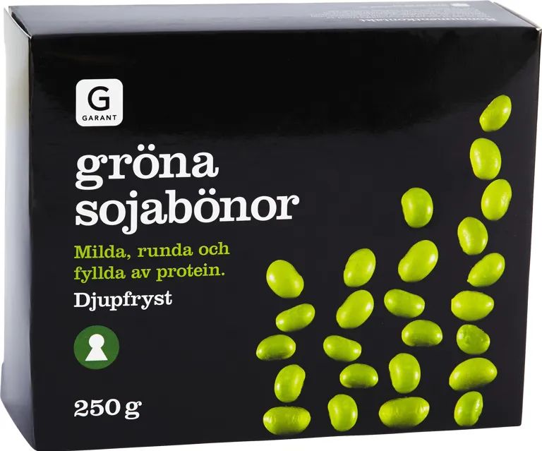 Djupfrysta gröna sojabönor. Milda, runda och fyllda av protein. 250 gram.