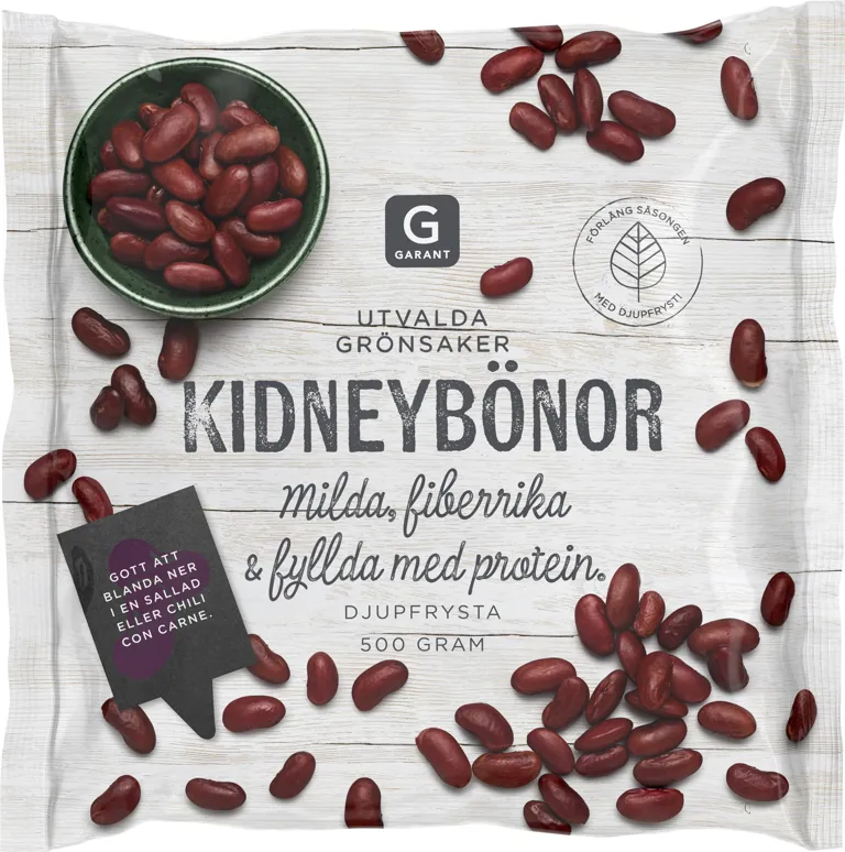 Djupfrysta kidneybönor från Garant. Milda, fiberrika och fyllda med protein. Gott att blanda i en sallad eller i chili con carne. 500 gram.