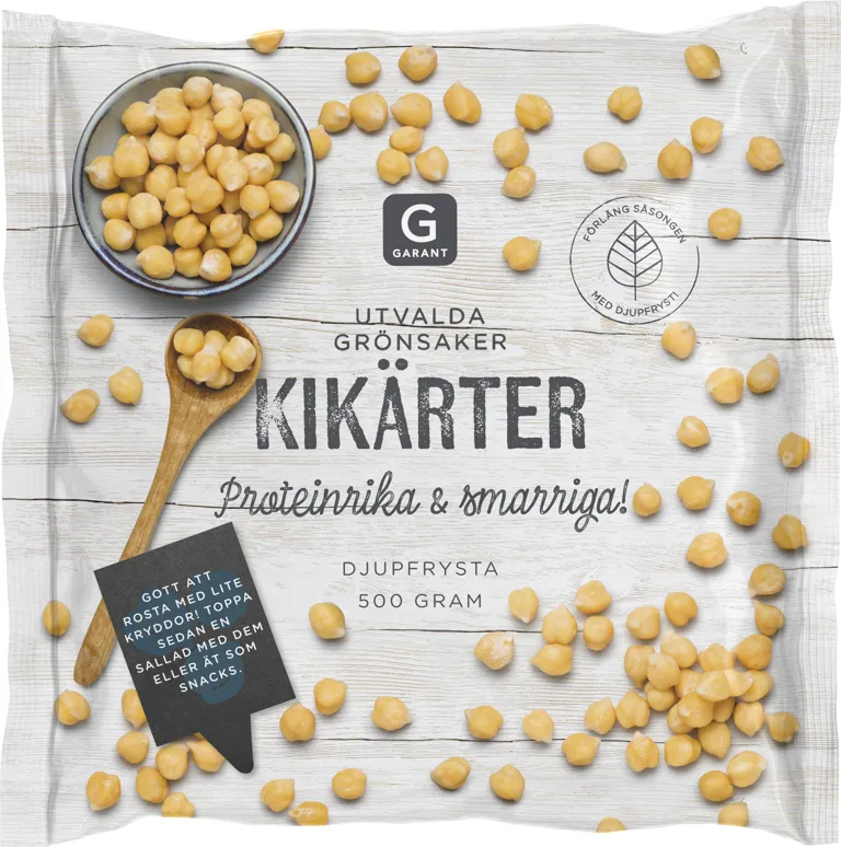 Djupfrysta kikärter från Garant. Proteinrika och smarriga. Goda att krydda och rosta ugnen eller att mixa till en slät hummus. 500 gram.