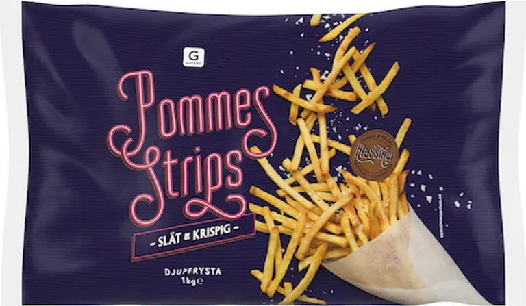 Djupfrysta pommes strips. Smarriga och krispiga. 1 kg.