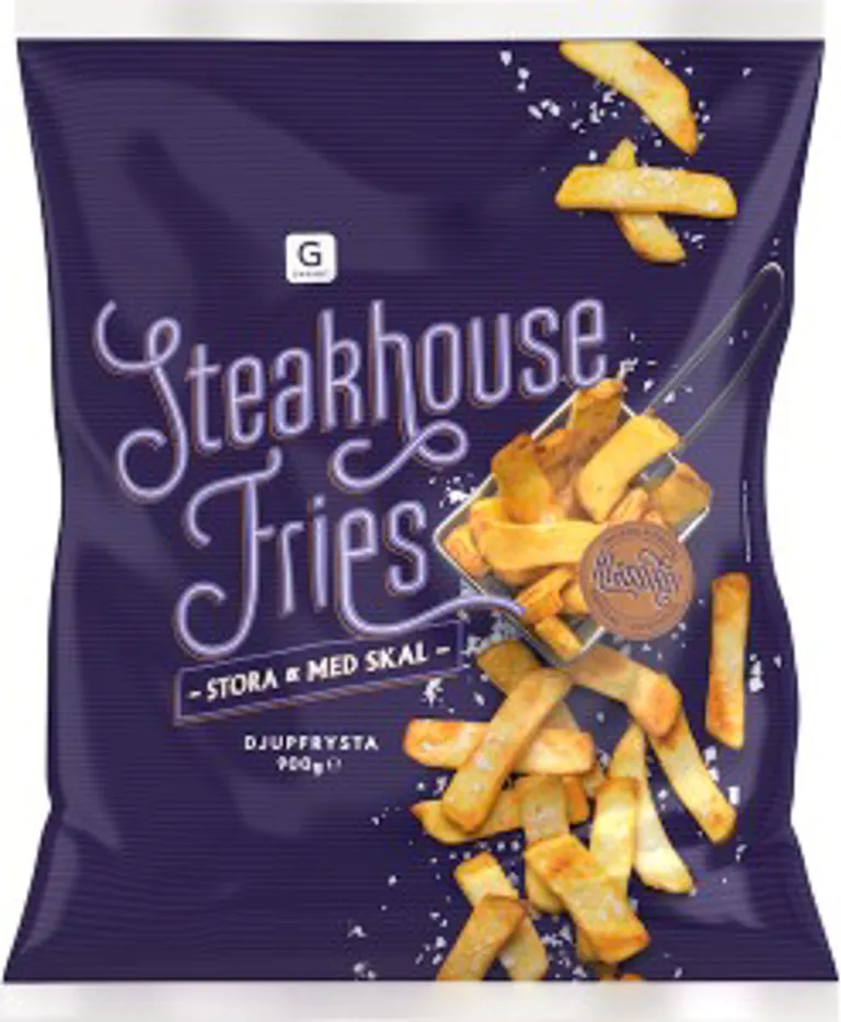 Djupfrysta stora steakhouse pommes. Krispiga med skal. 900 gram.