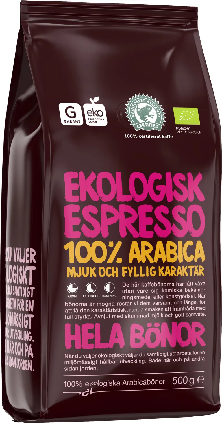 Ekologiska espressobönor med mjuk och fyllig karaktär. Hela bönor. 500 gram.