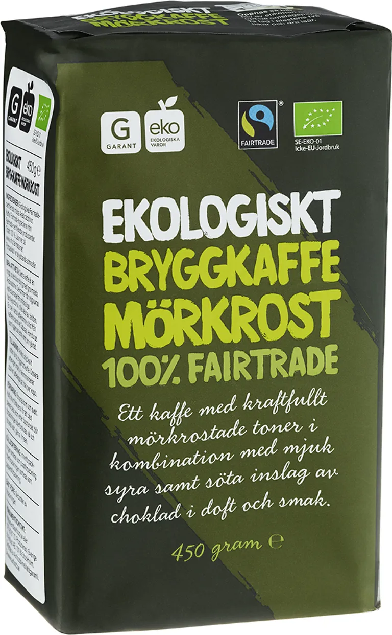 Ekologiskt bryggkaffe mörkrost. Kraftfulla mörkrostade toner i kombination med mjuk syra samt söta inslag av choklad. 100% fairtrade. 450 gram.