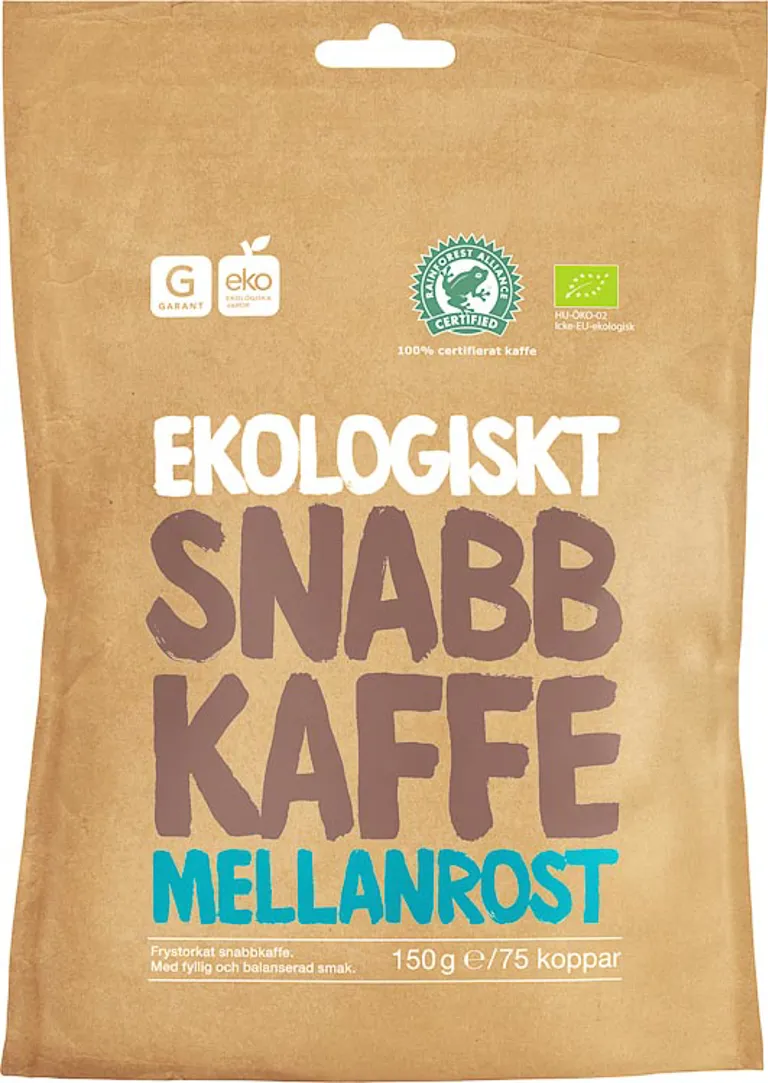 Ekologiskt snabbkaffe mellanrost. Frystorkat kaffe med fyllig och balansead smak. 75 koppar.