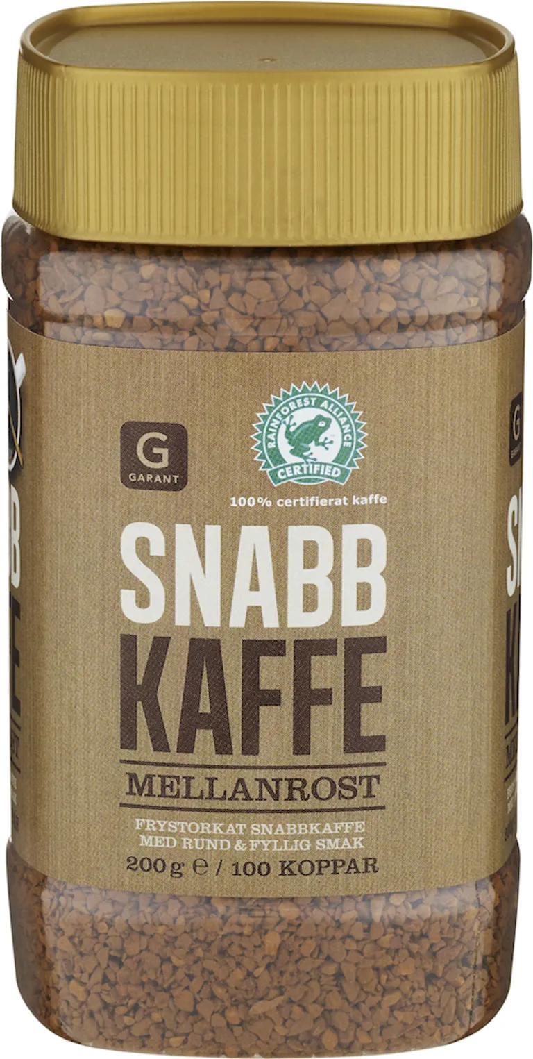 Frystorkat snabbkaffe*. *Fullständigt certifierat snabbkaffe från Rainforest Alliance-certifierade odlingar.