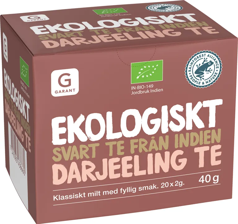 Ekologiskt Darjeeling te från Indien. Klassisk milt med fyllig smak. 20 påsar.