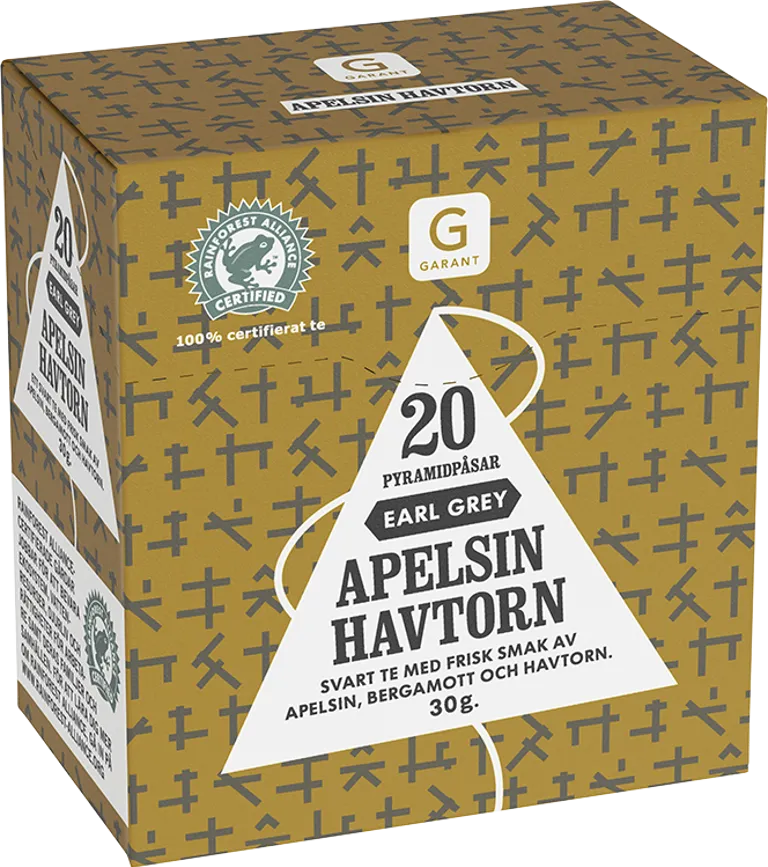 Svart te*, apelsinskal, naturlig citrusarom, naturlig arom, bergamott, havtornsbär. *Rainforest Alliance-certifierad.
