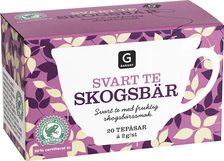 Svart te med fruktig skogsbärssmak. Det här teet är certifierat med Rainforest Alliance som jobbar för att bevara ekosystem, vattenresurser, djurliv och rättigheter för arbetare samt deras familjer och samhällen. Paketet innehåller 20 tepåsar.