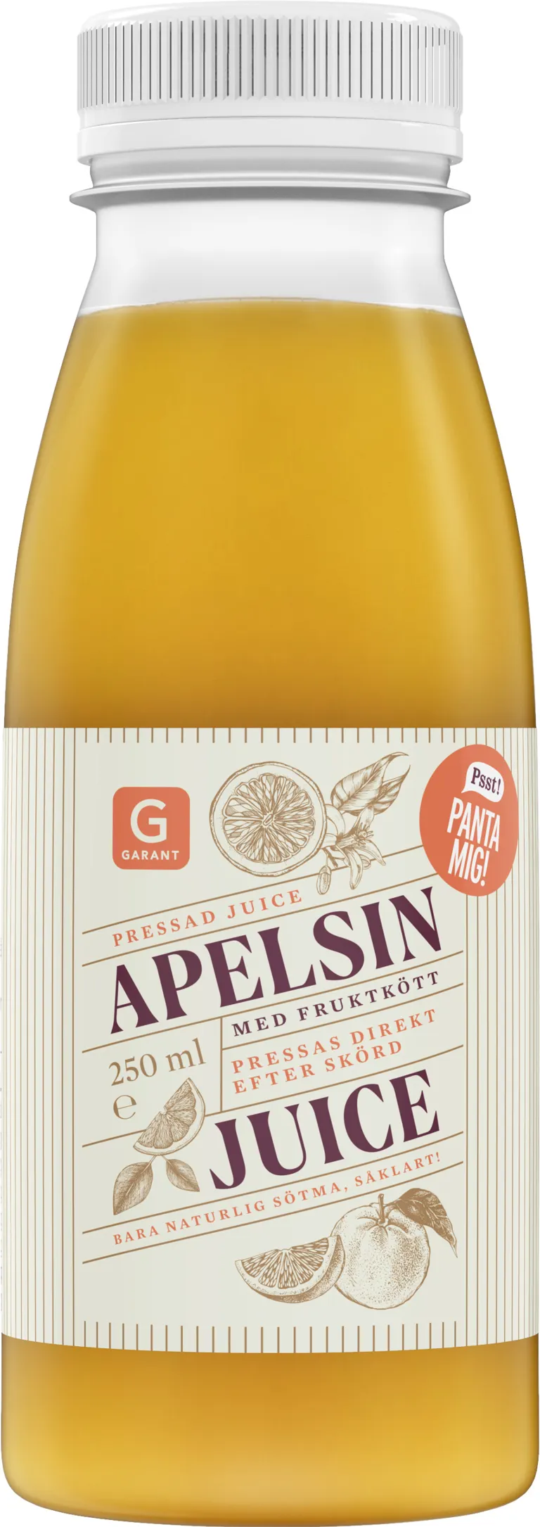 Pressad apelsinjuice med fruktkött. Pressas direkt efter skörd. 250 ml.