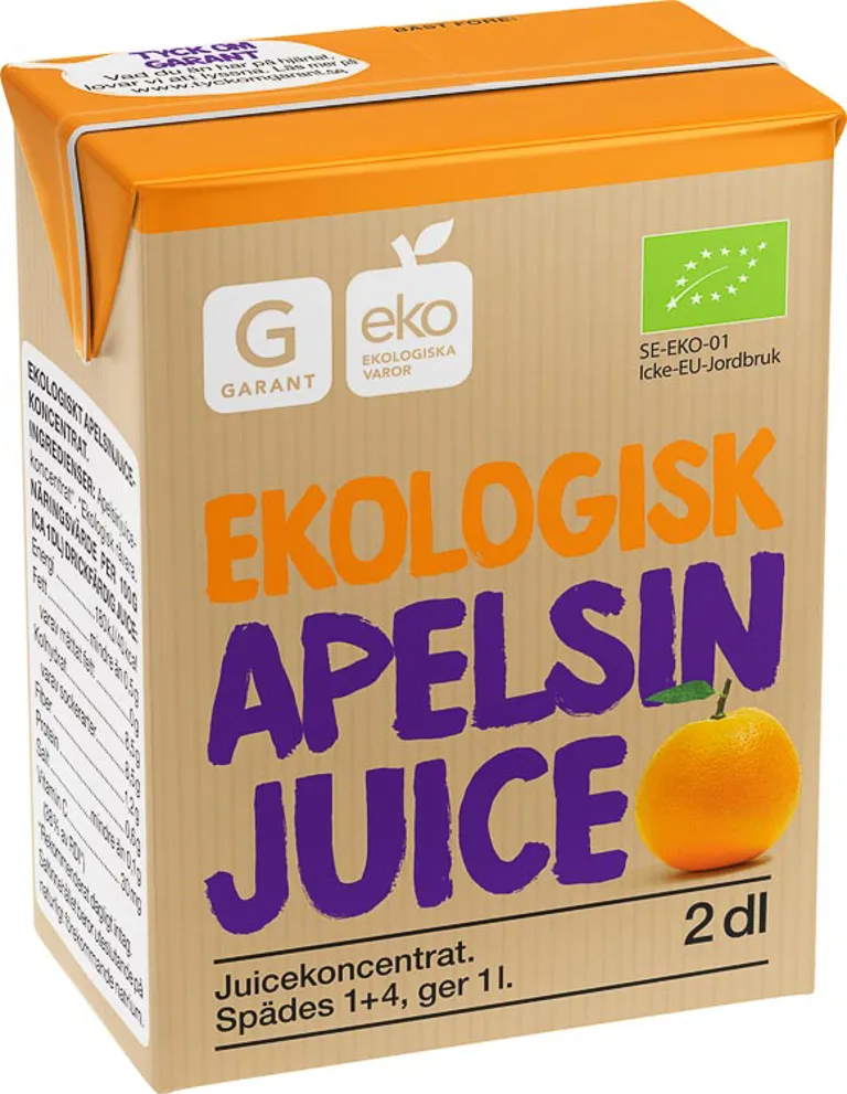 Ekologisk apelsinjuice av koncentrat. Spädes 1+4, ger 1 liter. 2dl.