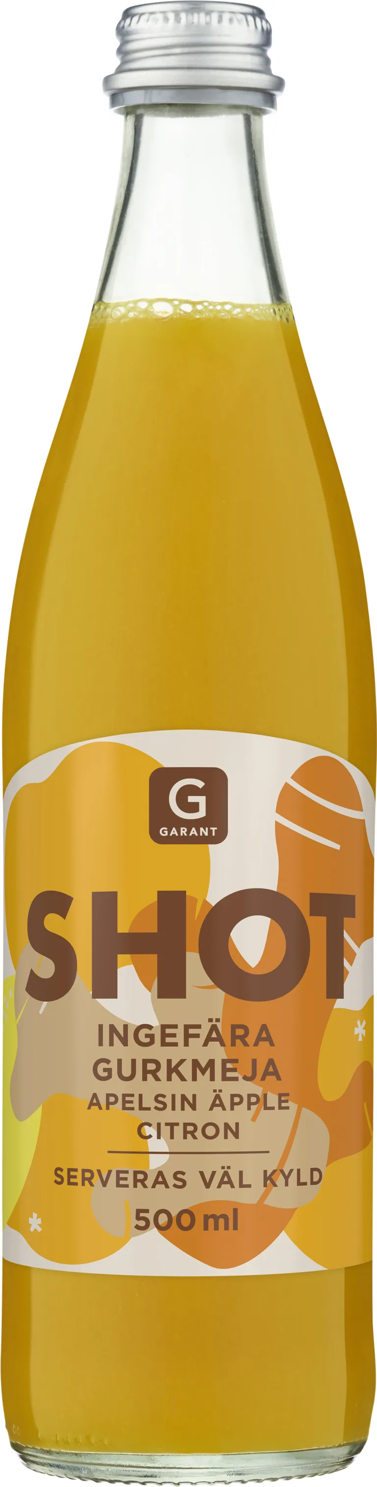 Shot med ingefära, gurkmeja, apelsin, äpple och citron. Serveras väl kyld! 500 ml.