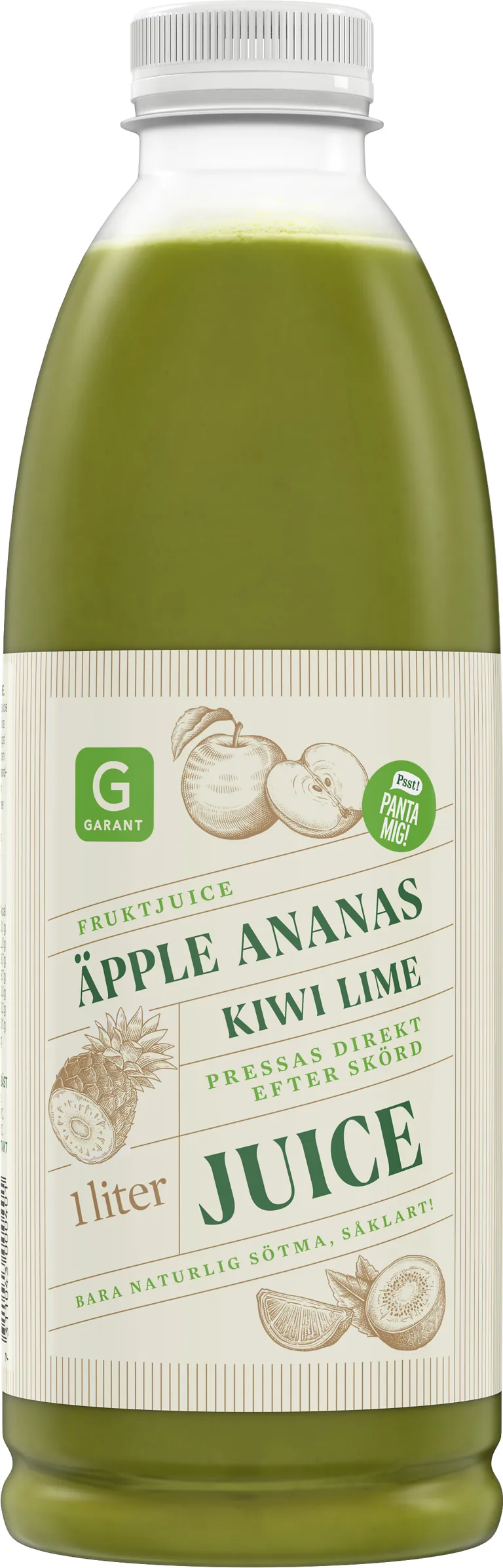 Fruktjuice med äpple, ananas, kiwi och lime. Pressas direkt efter skörd. 1 liter.