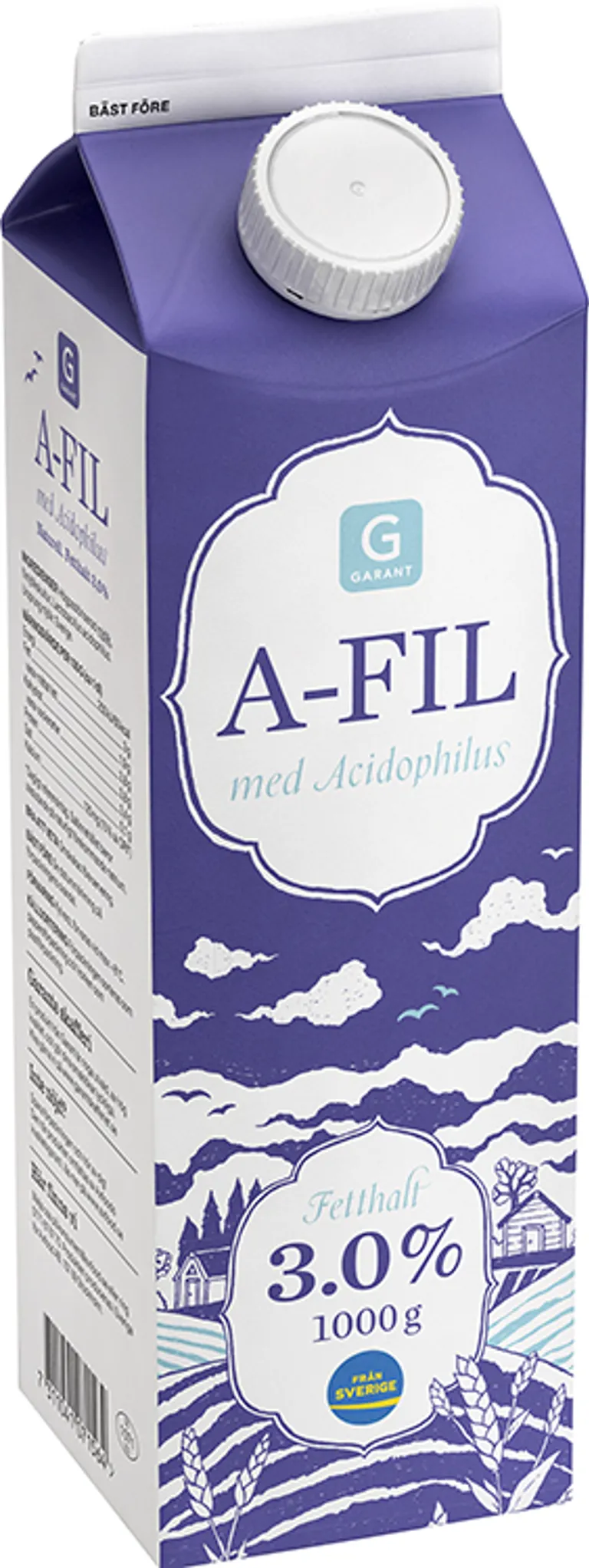 A-fil från Sverige. Filmjölk med acidophilus. Fetthalt 3%. 1000 gram.