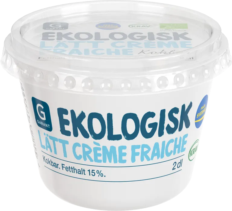 Ekologisk KRAV-märkt lätt crème fraiche gjord på grädde från svenska gårdar. Fetthalt 15 %. Garants ekomärkning talar om att en vara är ekologisk och ibland även KRAV-märkt. Vårt sortiment fylls hela tiden på med fler EKO-varor.