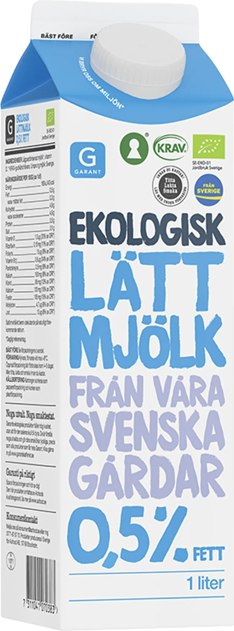 Ekologisk lättmjölk med längre hållbarhet. Från svenska gårdar. Fetthalt 0,5%. 1 liter.