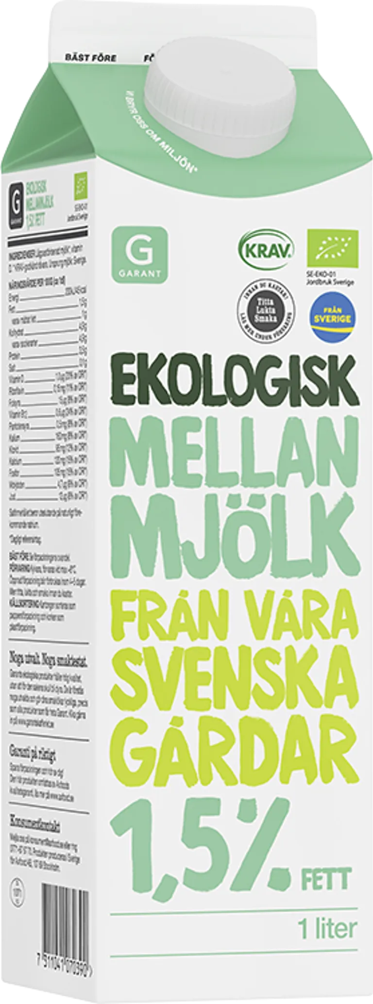 Ekologisk mellanmjölk med längre hållbarhet. Från Svenska gårdar. Fetthalt 1,5%. 1 liter.