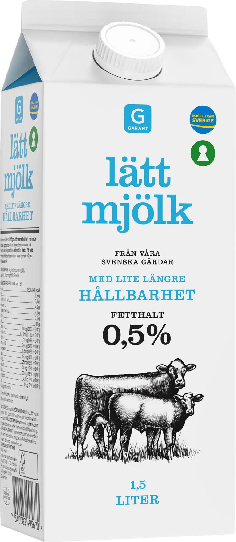 Lättmjölk från våra svenska gårdar. Med lite längre hållbarhet. Fetthalt 0,5%. 1,5 liter.