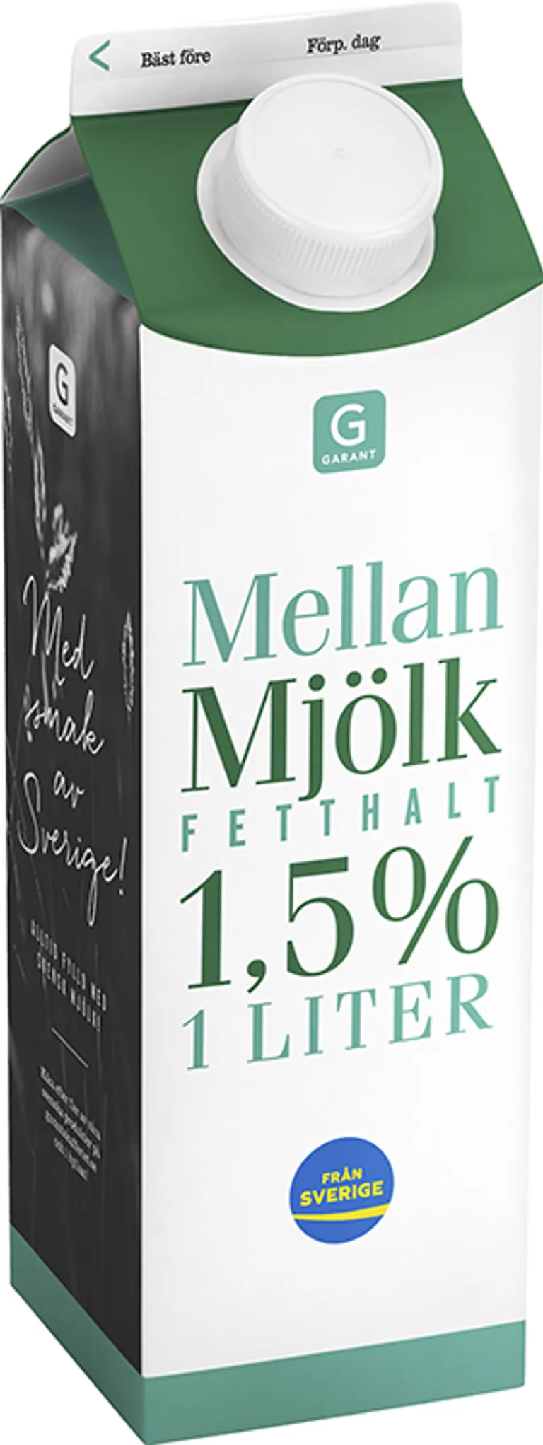 Mellanmjölk från Sverige. Fetthalt 1,5%. 1 liter.