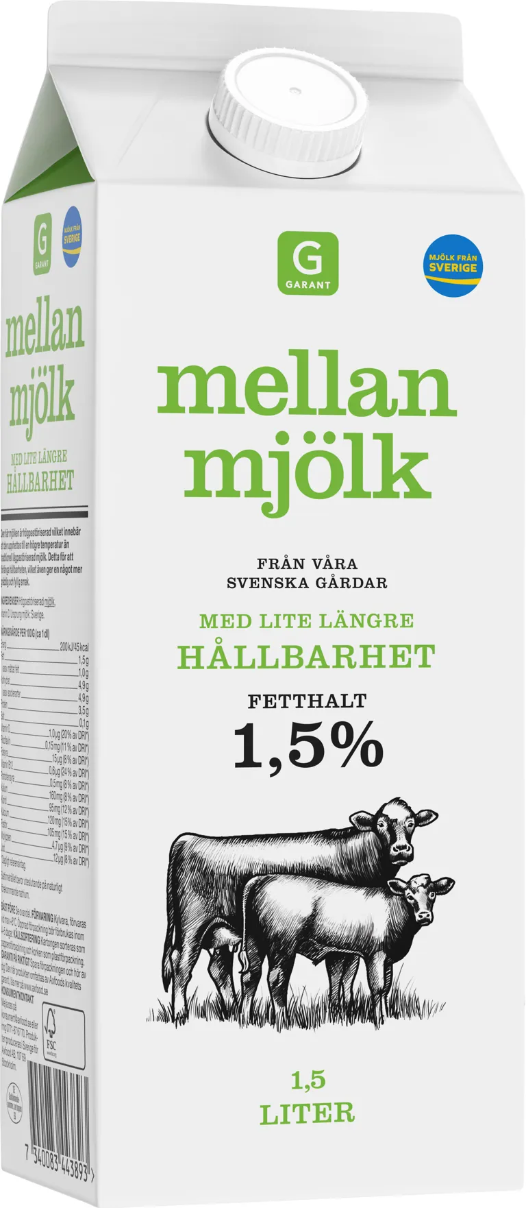Mellanmjölk från våra svenska gårdar. Med lite längre hållbarhet. Fetthalt 1,5%. 1,5 liter.