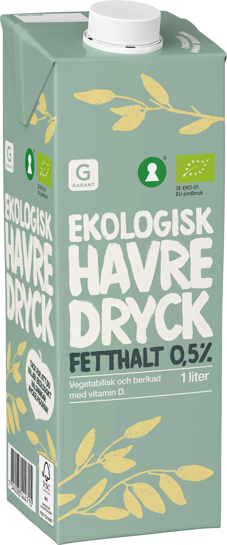 Ekologisk vegetabilisk havredryck. Breikad med vitamin D. Fetthalt 0,5%. 1 liter.