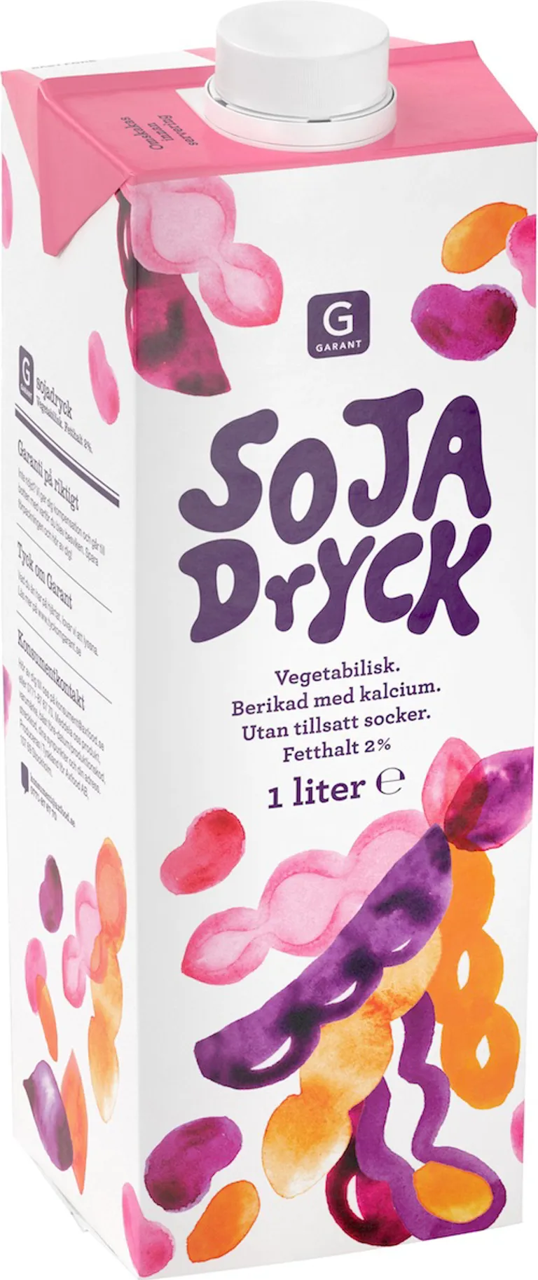 Vegetabilisk sojadryck. Berikad med kalcium, vitamin D, E, B12 och riboflavin. Fetthalt 2%. 1 liter.