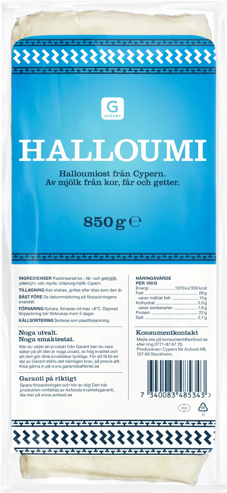 Halloumi från Cypern. Av mjölk från kor, får och getter. 850 gram.