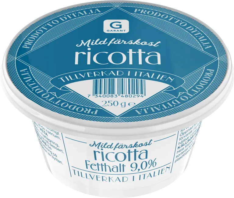 Ricotta. Mild färskost tillverkad i Italien. Fetthalt 9%. 250 gram.