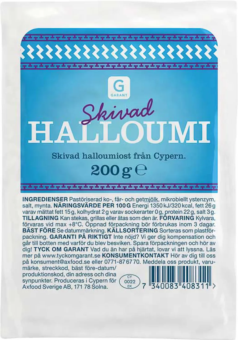 Pastöriserad ko-, får- och getMJÖLK, ystenzym, salt, mynta.
