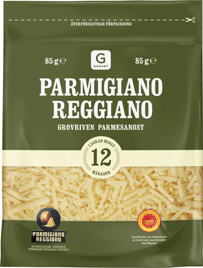 Grovriven Parmigiano reggiano. Parmesanost lagrad minst 12 månader. 85 gram.