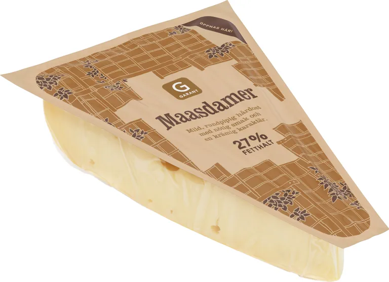 Mild maasdamer. Rundpipig, hårdost med nötig smak och en krämig karaktär. Fetthalt 27%. Ca 620 gram.