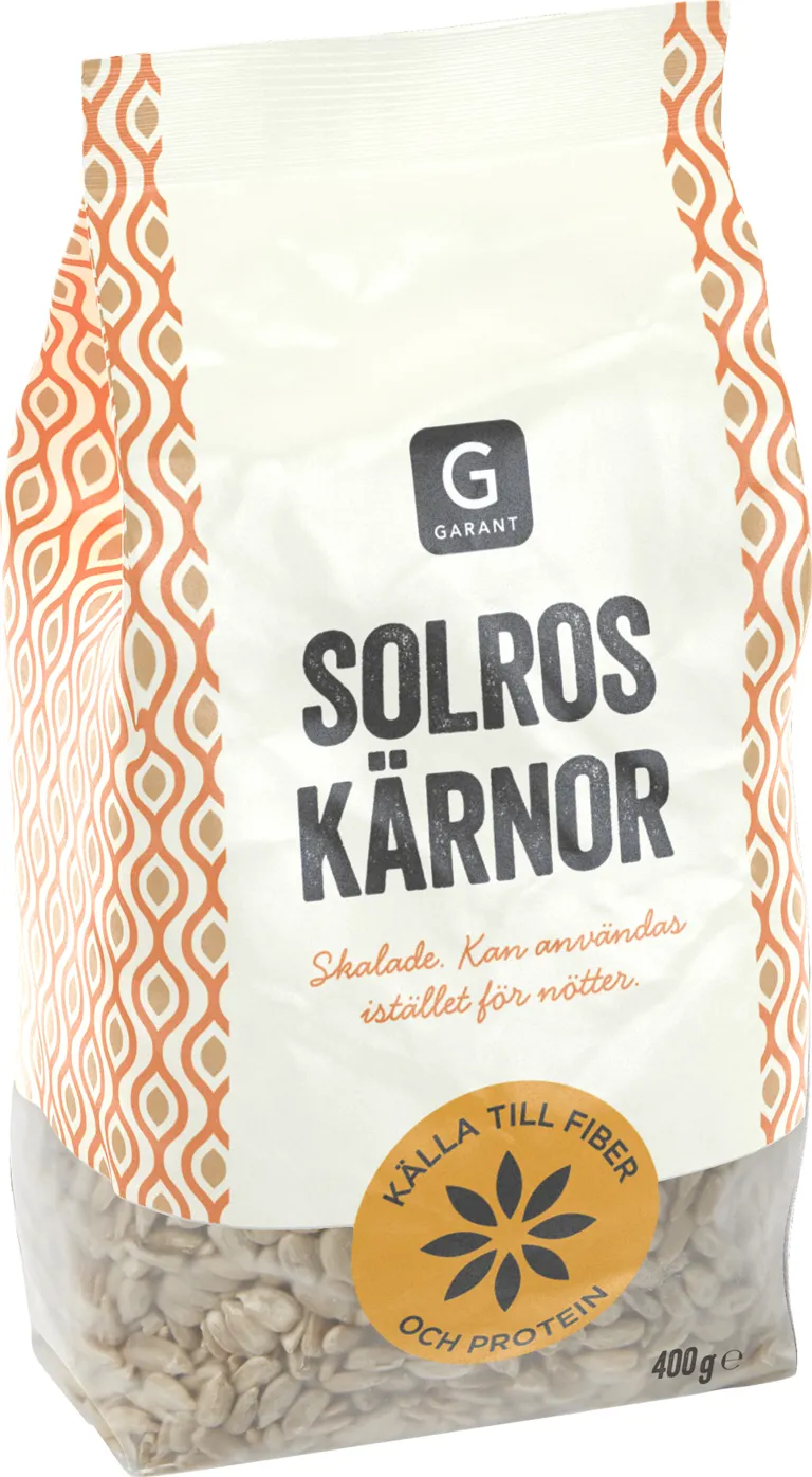 Skalade solroskärnor. Kan användas istället för nötter. Källa till protein och fiber. 400 gram.