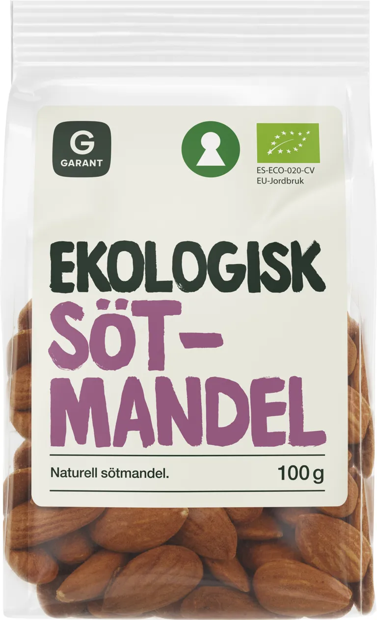 Ekologisk SÖTMANDEL. Kan innehålla spår av JORDNÖT, HASSELNÖT, VALNÖT, CASHEWNÖT, PEKANNÖT, PARANÖT, PISTASCHNÖT och MACADAMIANÖT.