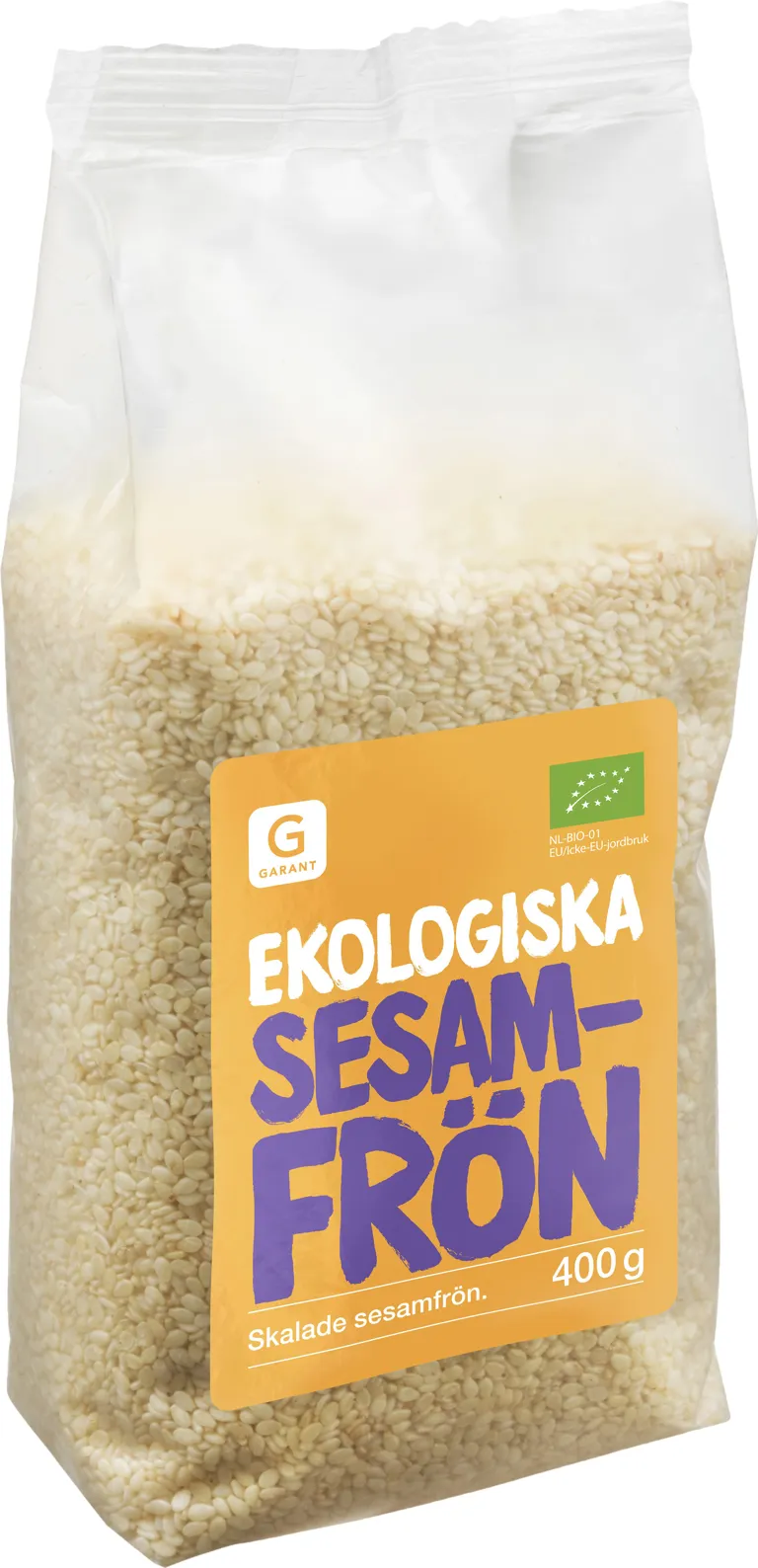 Skalade sesamfrön*. *Ekologisk råvara. Kan innehålla spår av GLUTEN.