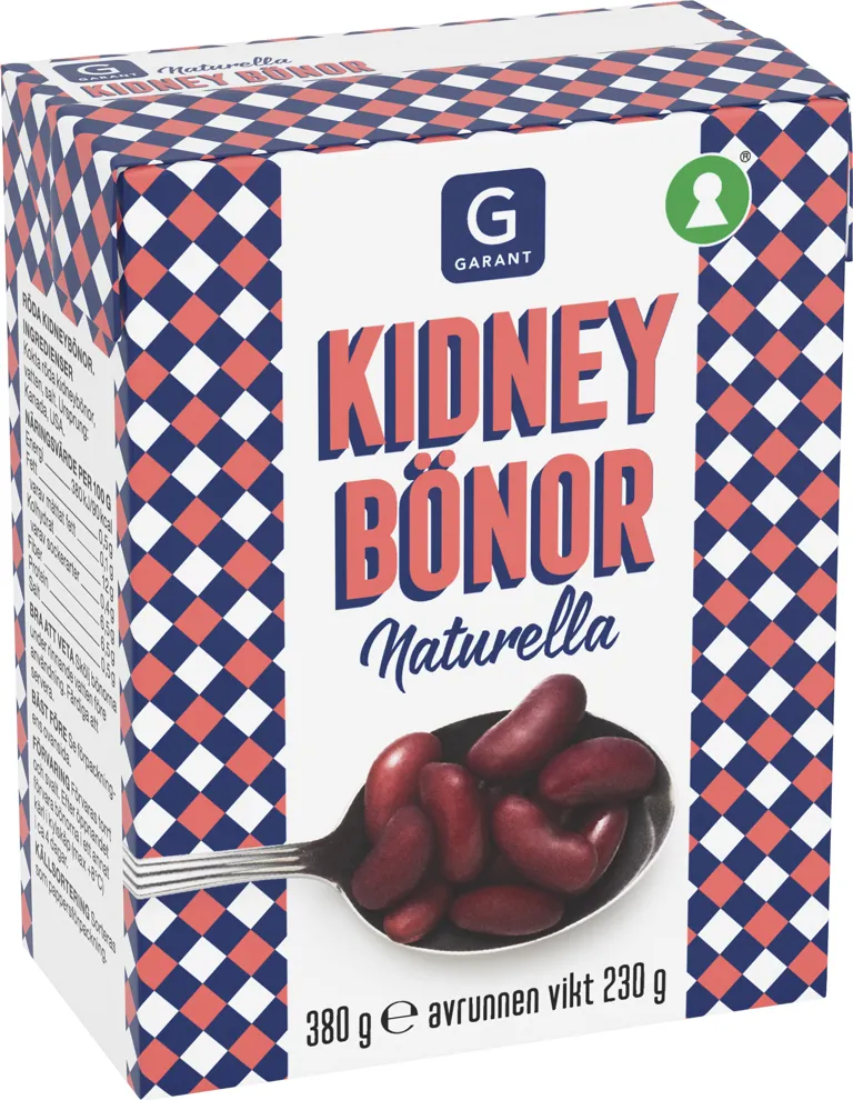 Naturella kidneybönor. 380 gram, avrunnen vikt 230 gram.
