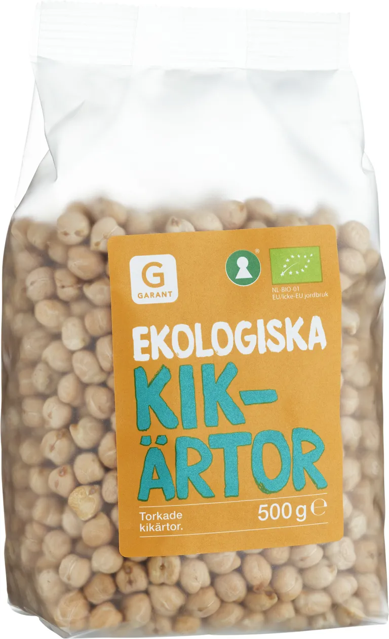 Torkade kikärter*. *Ekologisk råvara. Kan innehålla spår av GLUTEN.