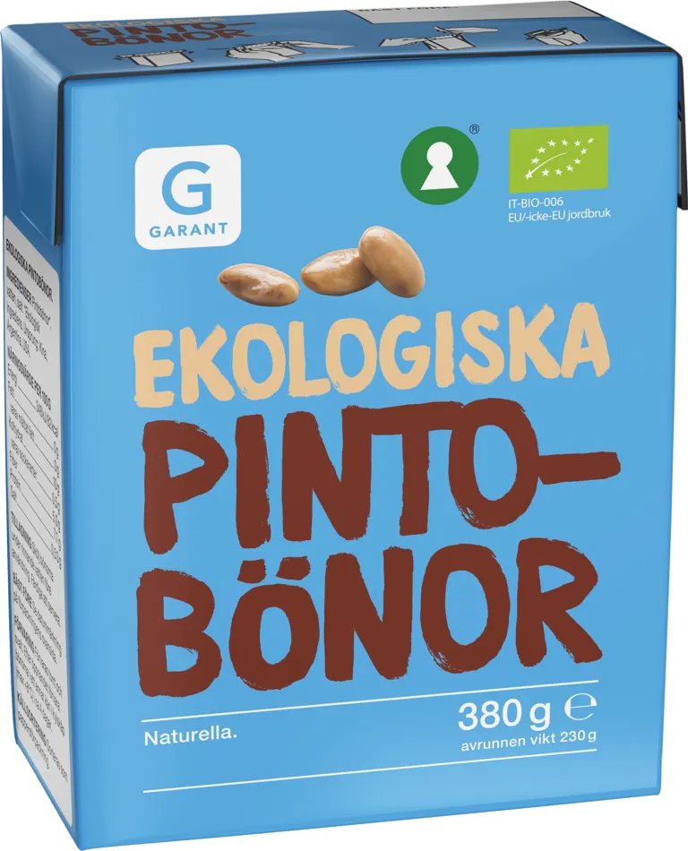 Ekologiska naturella pintobönor. 380 gram varav 230 gram avrunnen vikt.