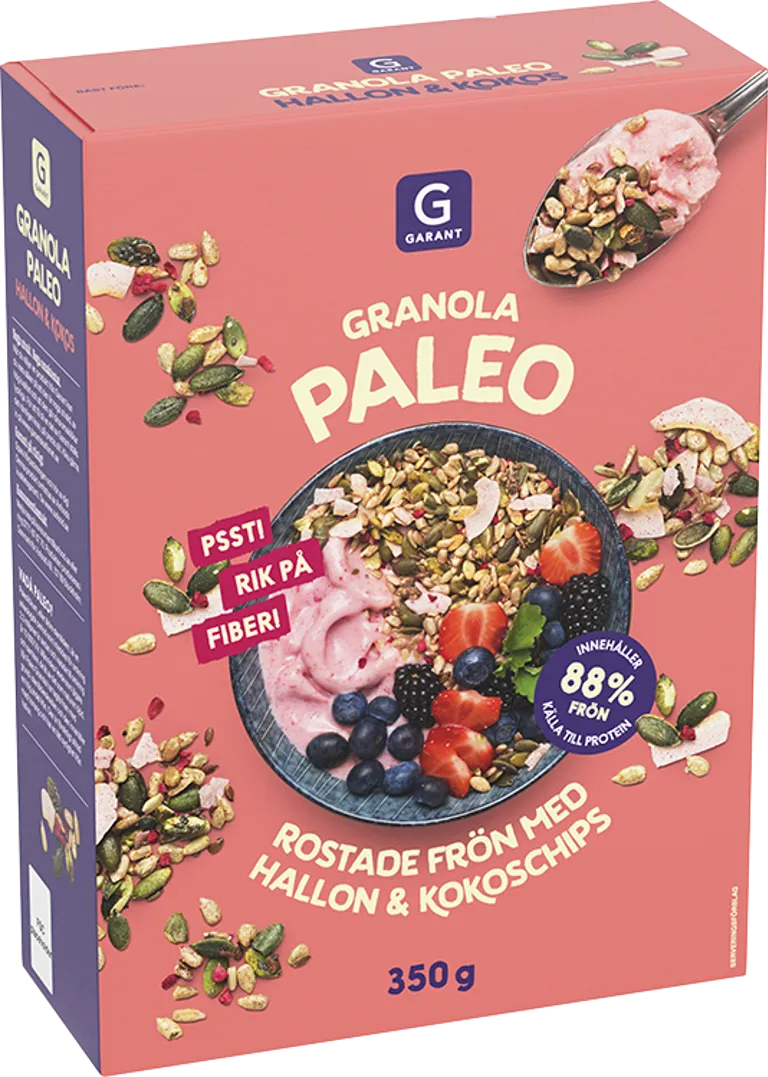 Granola paleo med rostade frön, hallon och kokoschips. 88% frön. 350 gram.