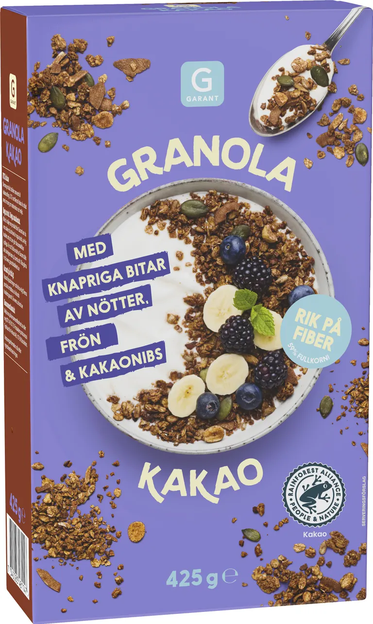 Granola med knapriga bitar av nötter, frön och kakaonibs. Rik på fiber. 425 gram.