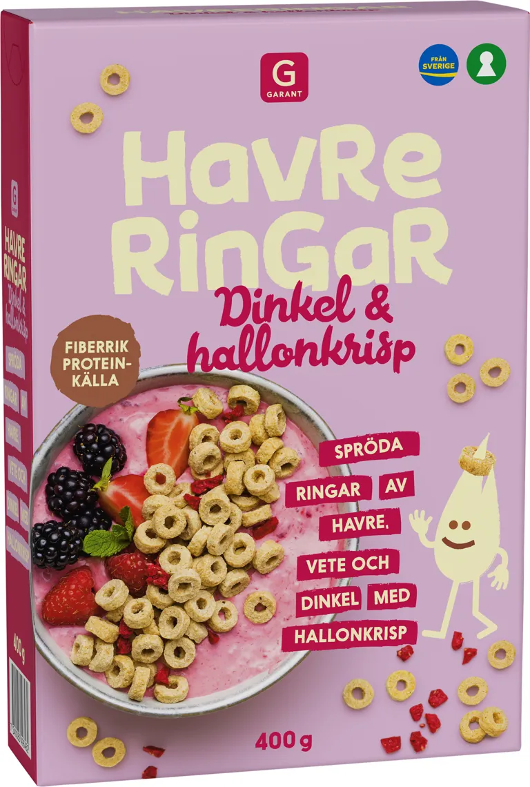 Havreringar med dinkel och hallonkrisp. Spröda ringar av havre. Fiberrik och proteinkälla. 400 gram.