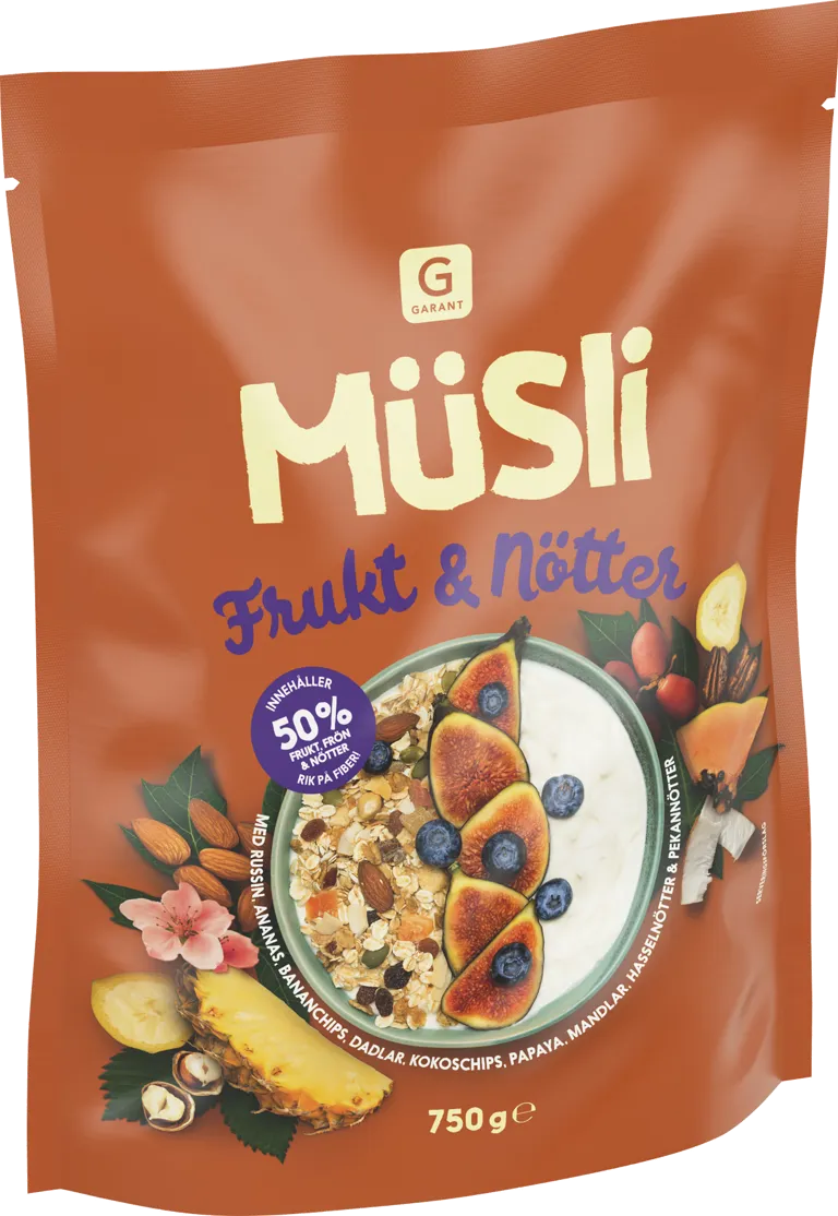 Müsli med russin, ananas, bananchips, dadlar, kokoschips, papaya, mandlar, hasselnötter och pekannötter. Innehåller 50% frukt, frön och nötter.