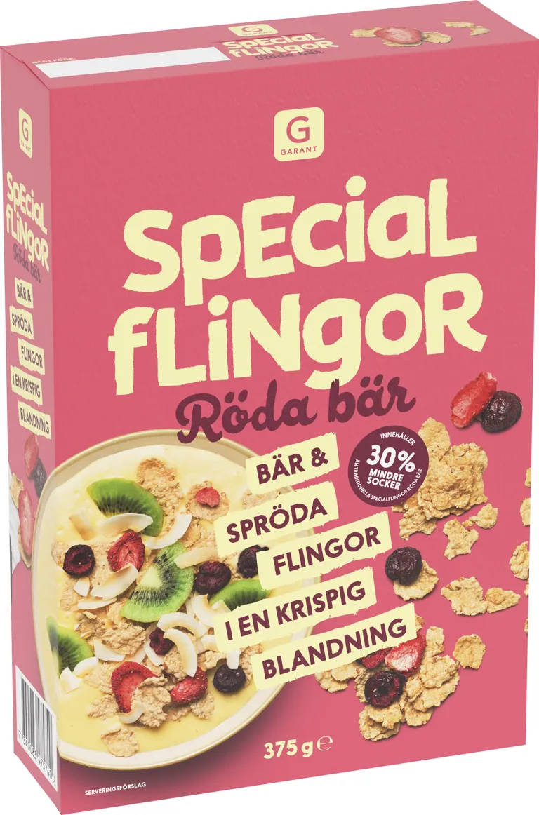 Specialflingor röda bär. Bär och spröda flingor i en krispig blandning. 30% mindre socker. 375 gram.