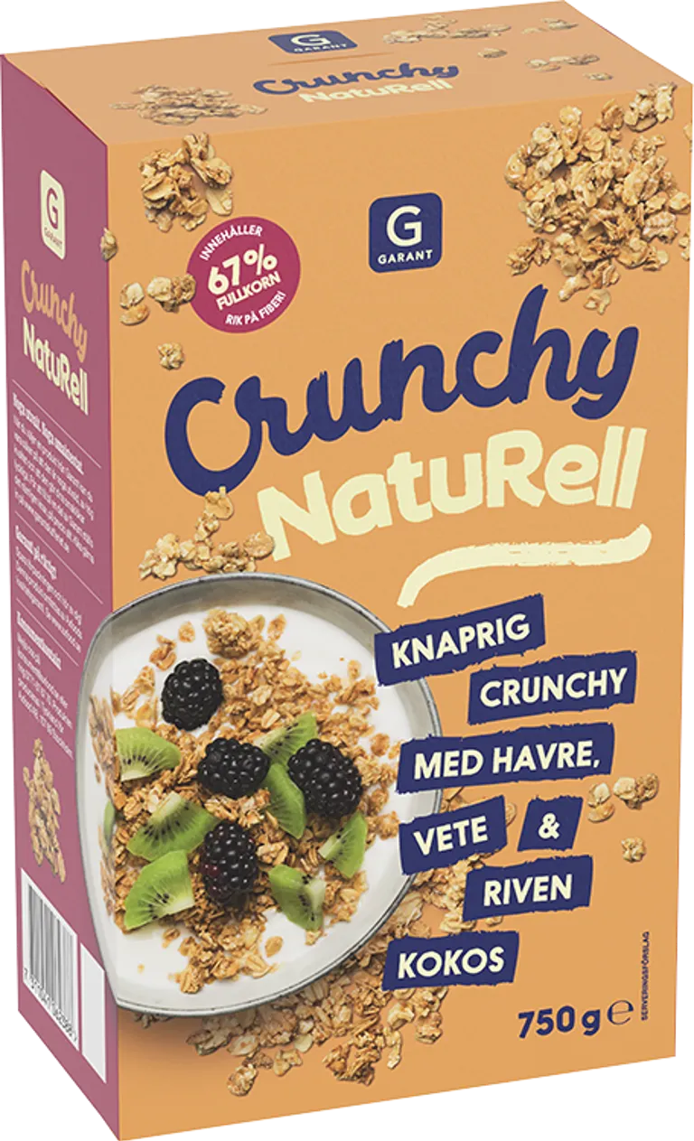 Chrunchy naturell granola. Knaprig med havre, vete och riven kokos. 750 gram.