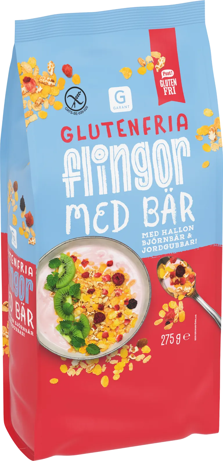 Glutenfria flingor med hallon, björnbär och jordgubbar. 275 gram.