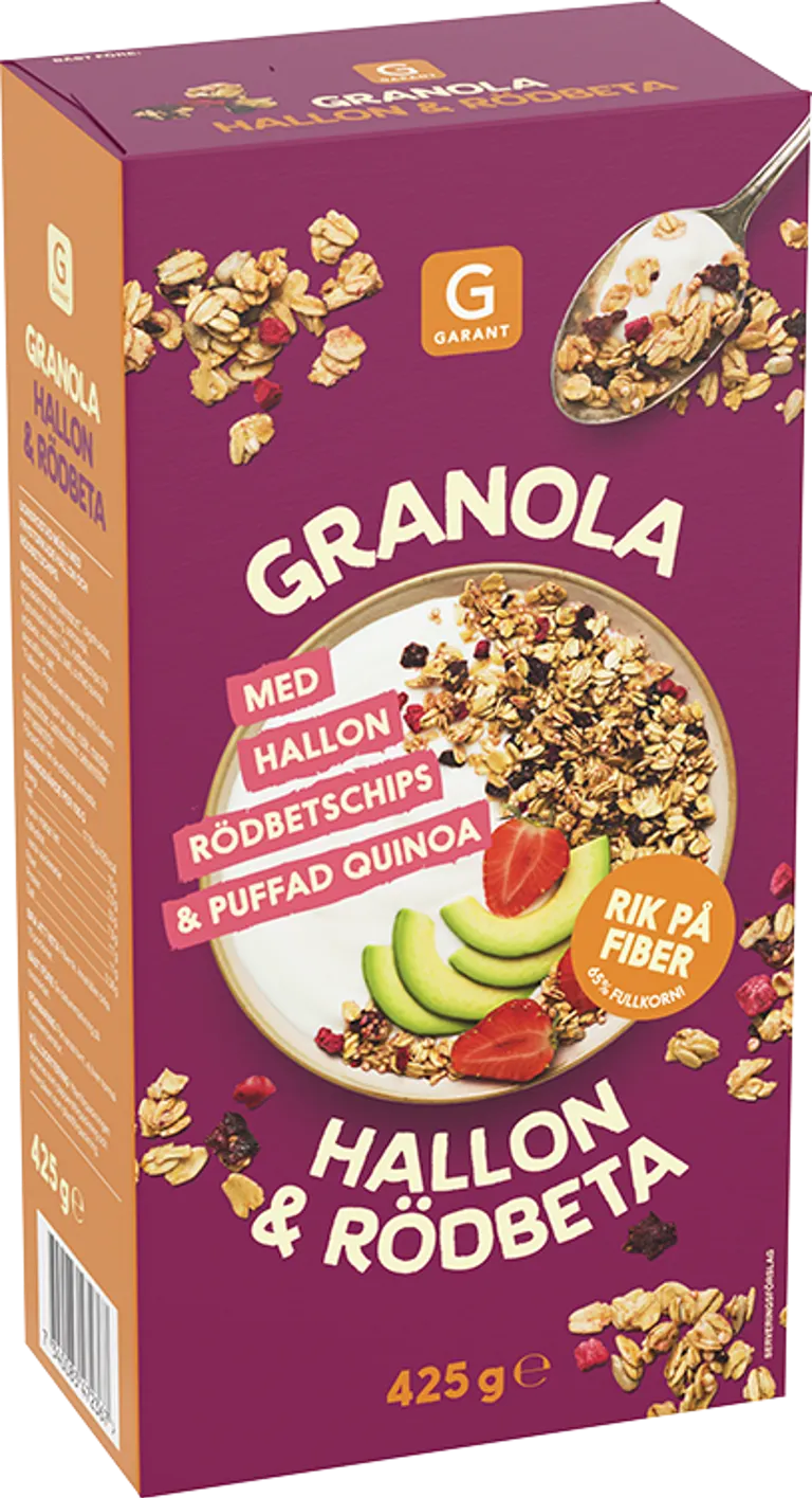 Vår fiberrika granola med hallon, rödbeta och puffad quinoa är noga utvald för sin goda smak. Sätter guldkant på frukosten och som topping på desserten!
